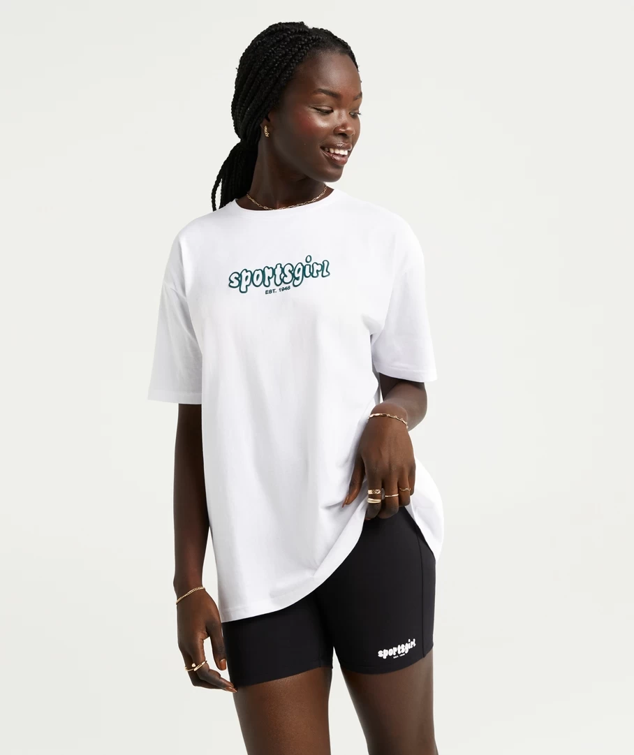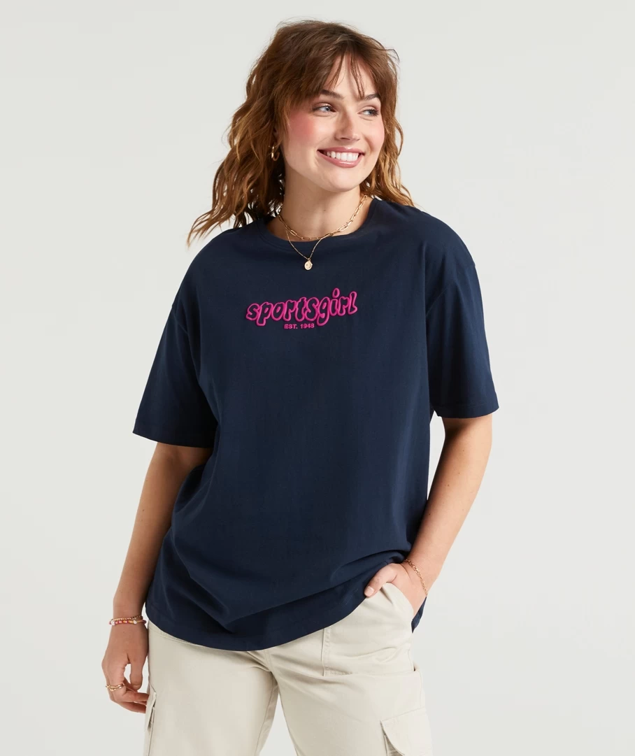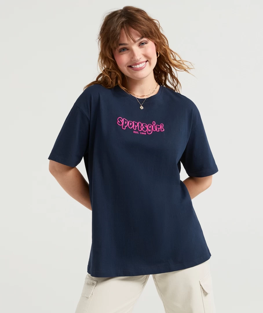 You will be wearing it on repeat – the Rewind Repeat Bubble Logo Boyfriend T-Shirt. Made with 100% cotton, oversized fit, full length, short sleeves, the Sportsgirl logo on the front and repeated on the back. Pair with denim bottoms or rewind bike shorts for a casual look.
