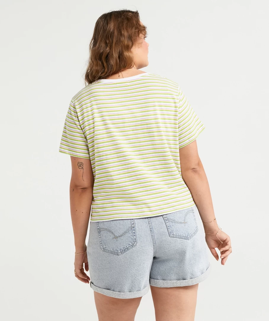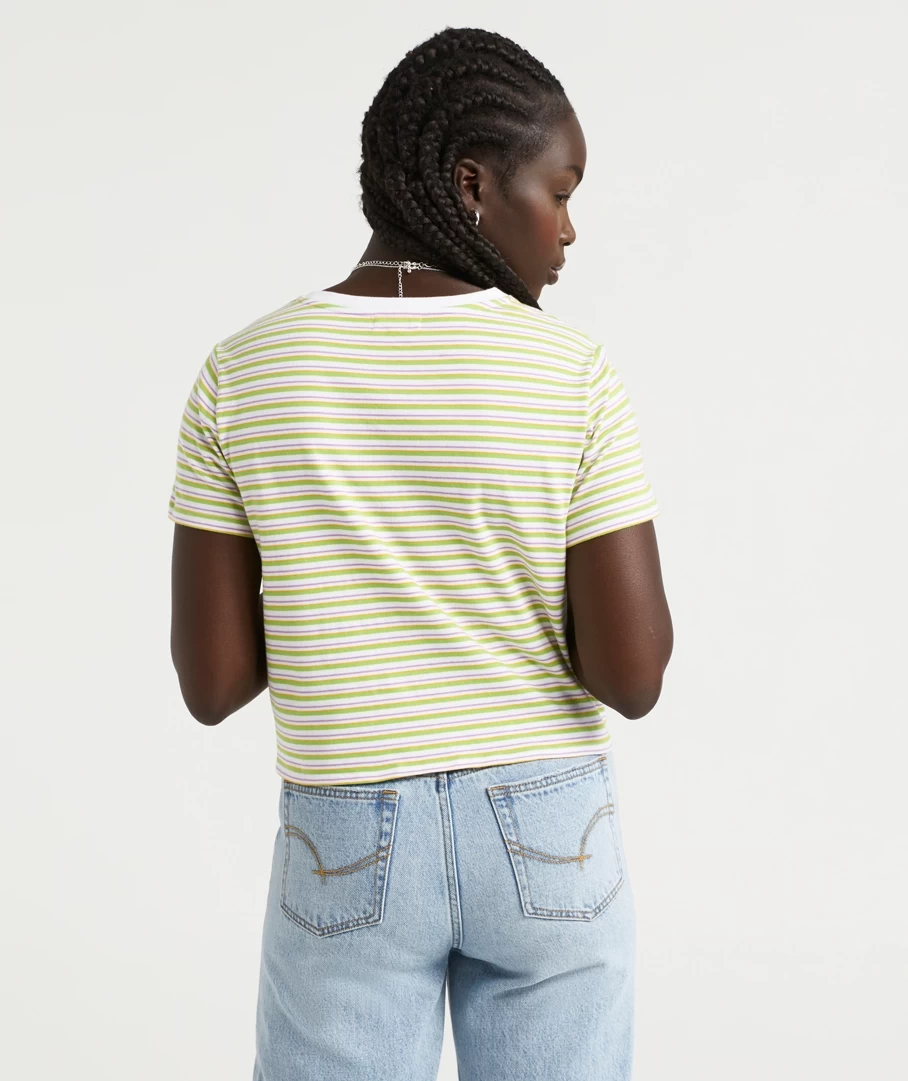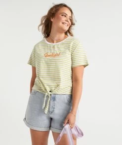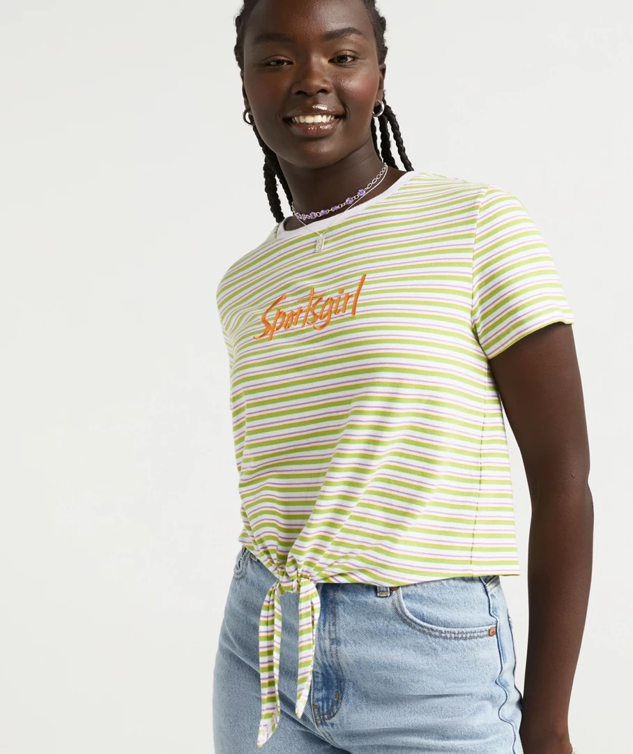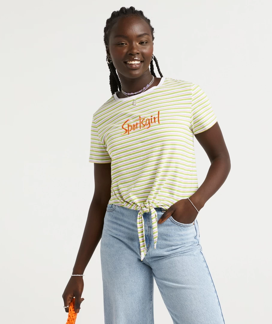 The Rewind Tie Front T-Shirt – A basic tee that is not so basic! Made with 100% cotton, short sleeves, cropped length, relaxed fit, knot detail and the Sportsgirl logo embroidered on the front. Pair with your fave pants for a casual look.
