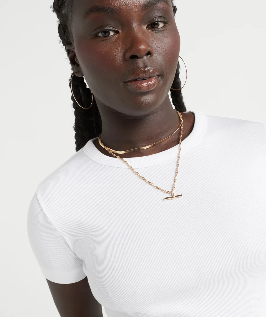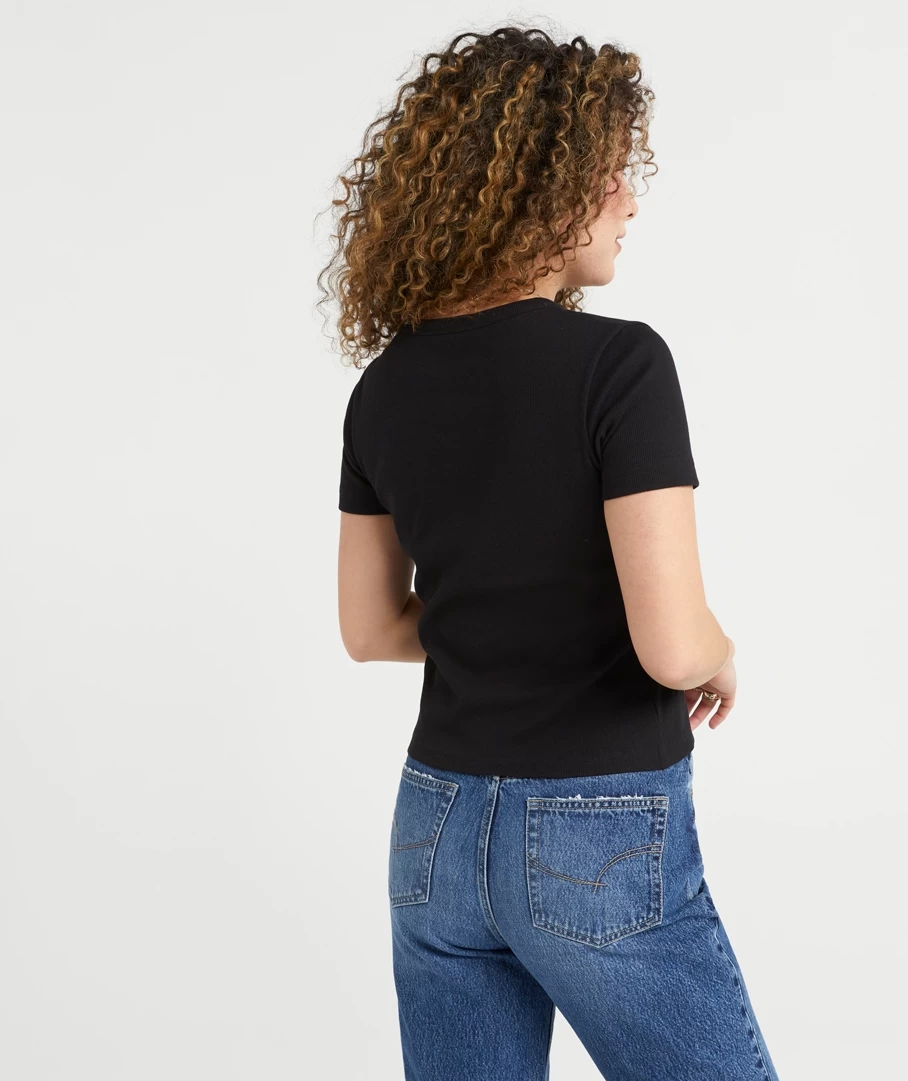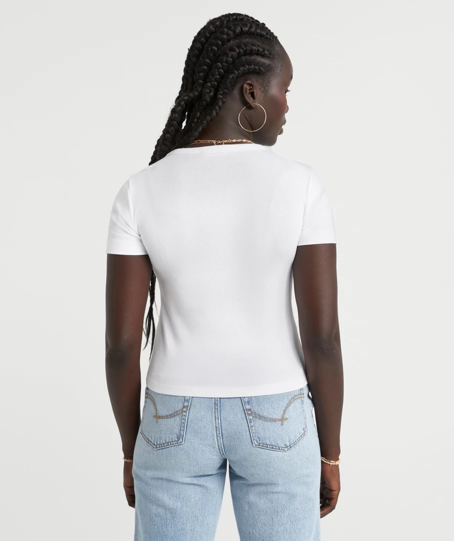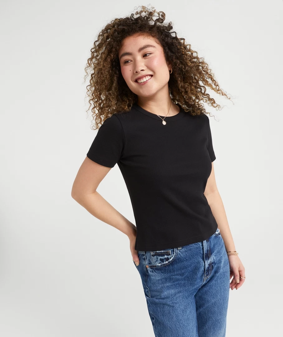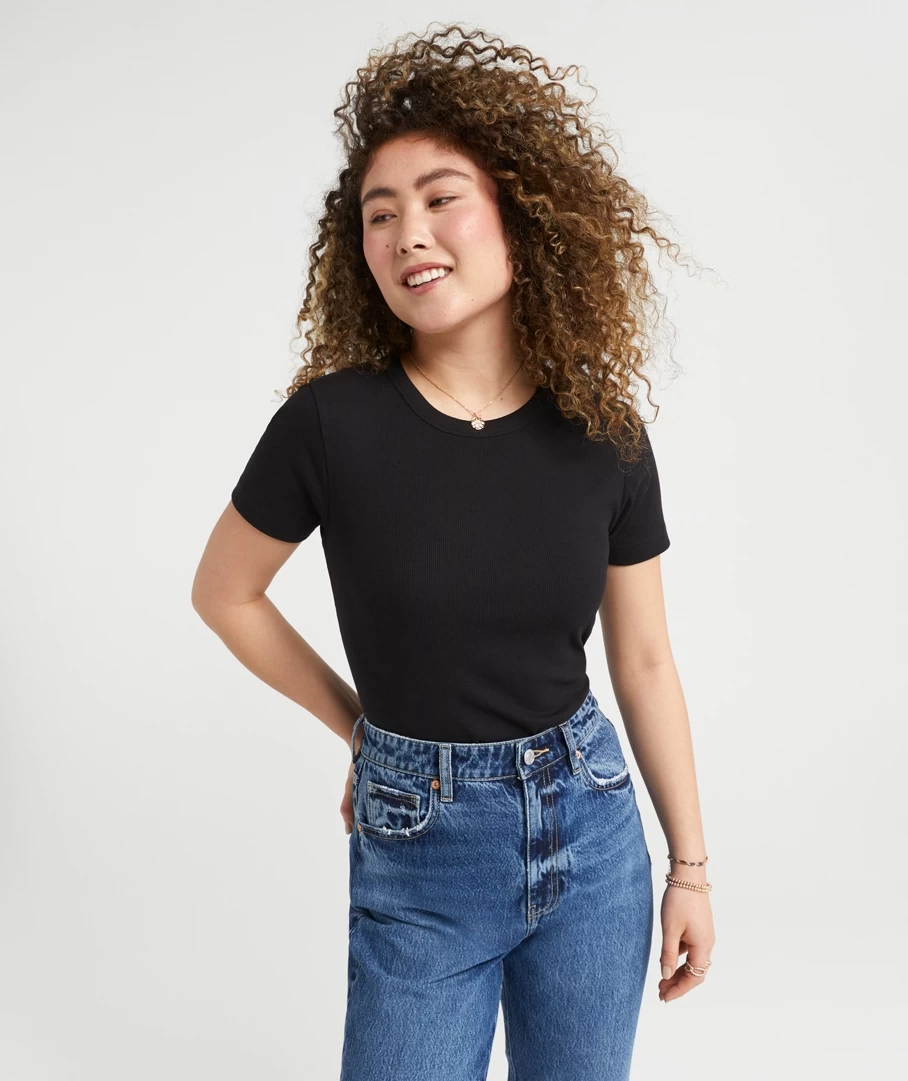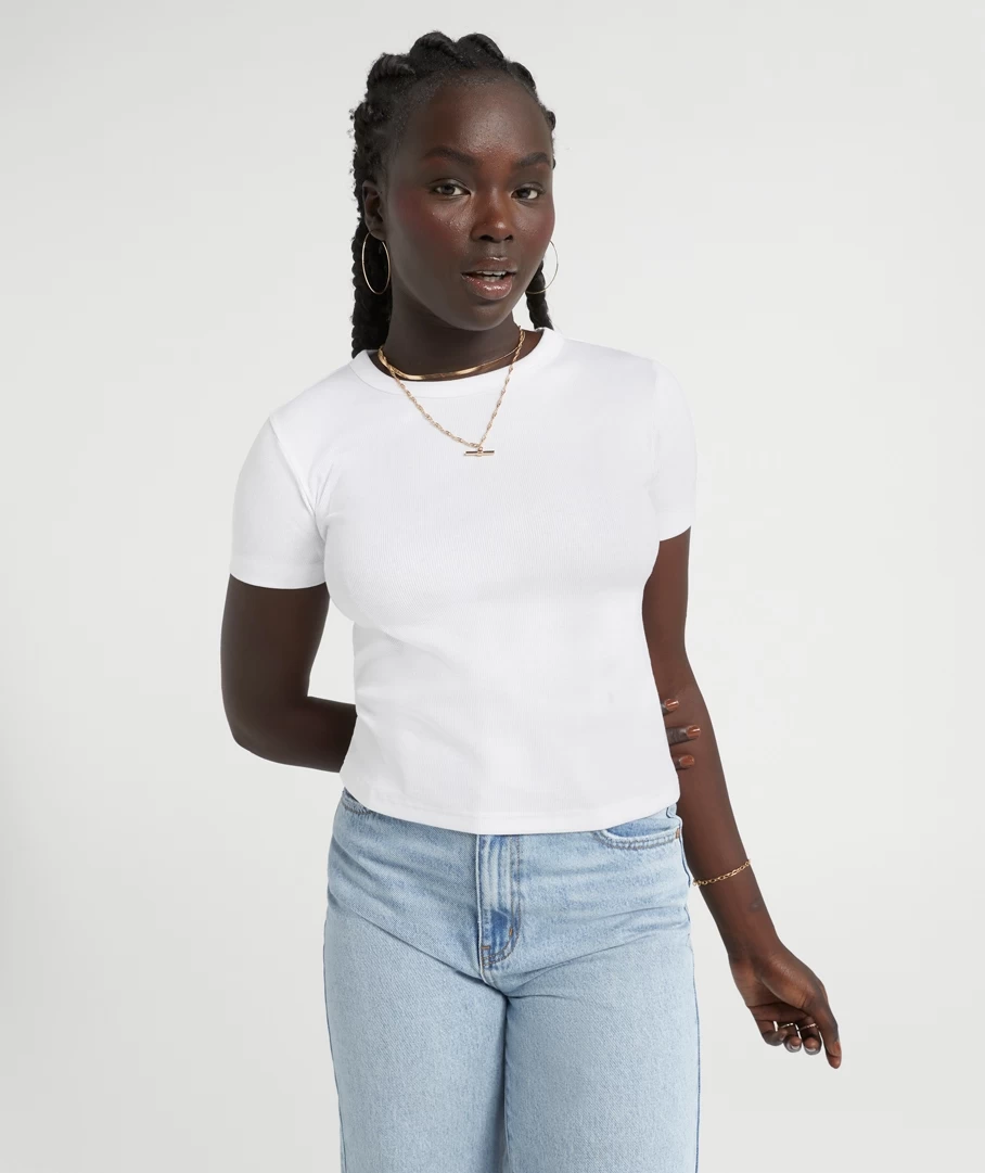 Our Rib Baby T-Shirt is the must have essential wardrobe piece of the season. With a Cotton / Elastane ribbed fabrication this tee fits perfectly to the body and holds a multitude of styling potential. It is all in the details with this core basic, as it features twin needle stitch hemline, easy wear short sleeves and a versatile body length to style tucked or draped over your fave jeans.