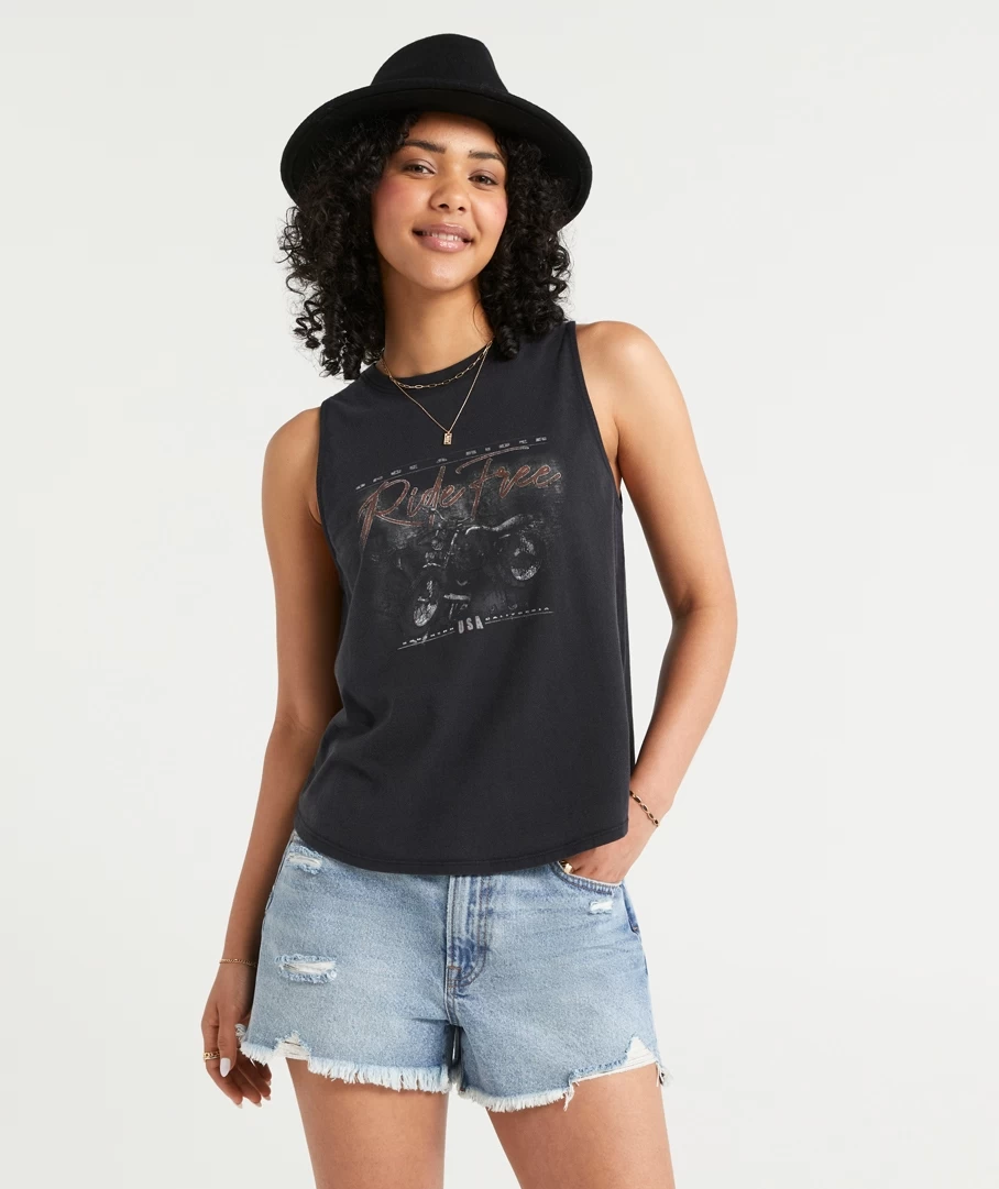 The popular Ride Free Graphic is now here in a tank! Made wih 100% cotton, loose fit, muscle tank shape, washed black colour and graphic in the center.
