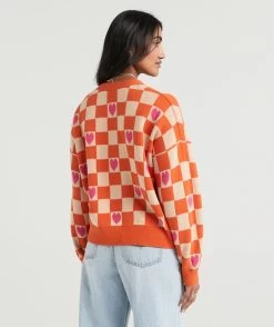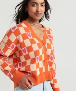 Add a pop of colour to any look with the ultimate knit, the Romaine Jacquard Knit Cardi. The orange check print can be styled multiple ways! Made with a blend of fabrics, featuring a V neck, and button closure. Pair with jeans to elevate a casual style or over a fun dress for a pop of colour.