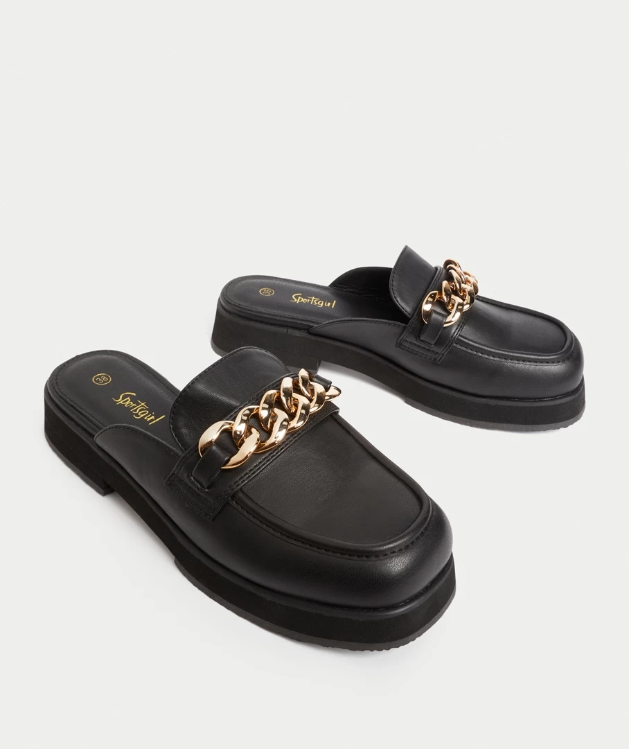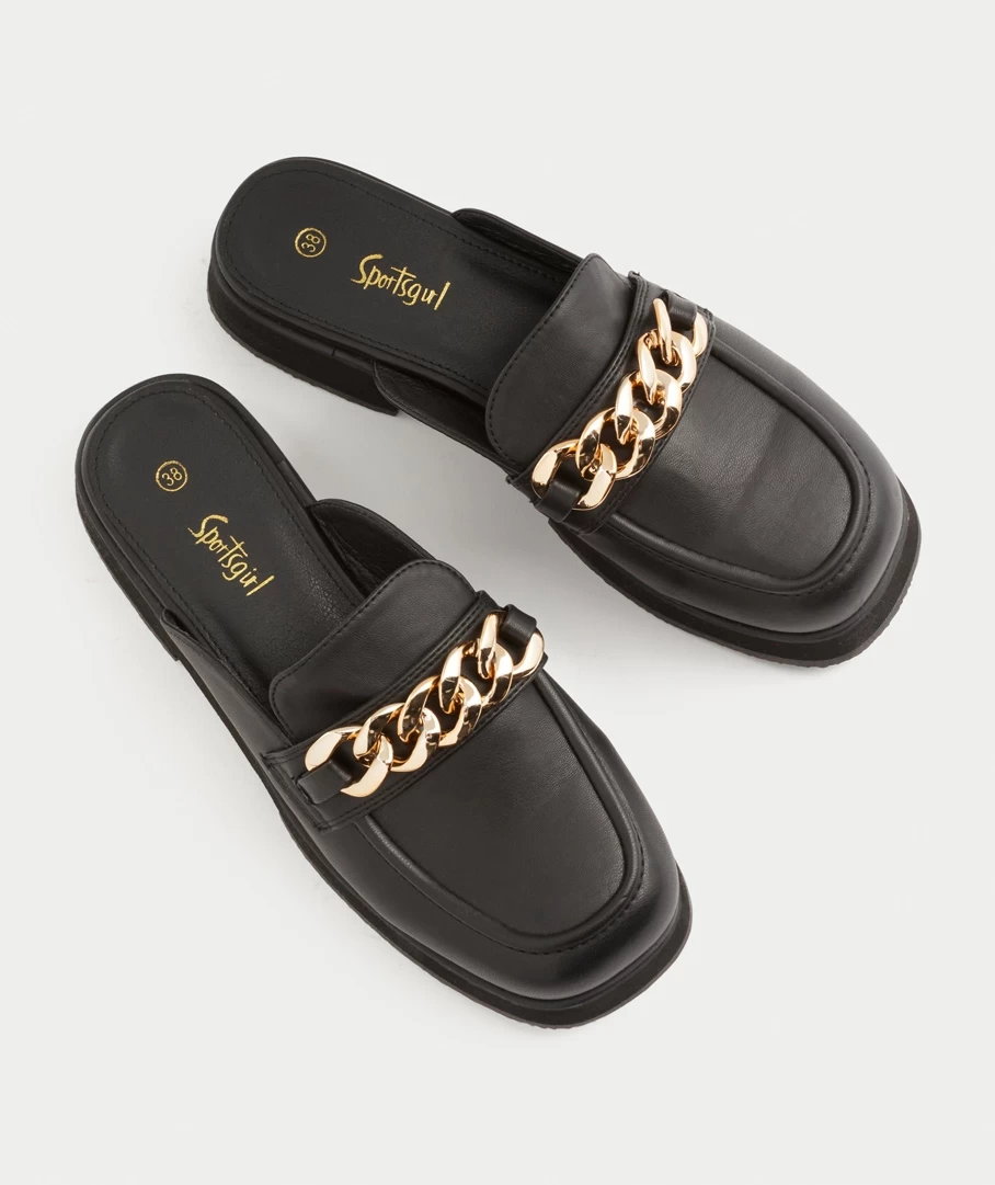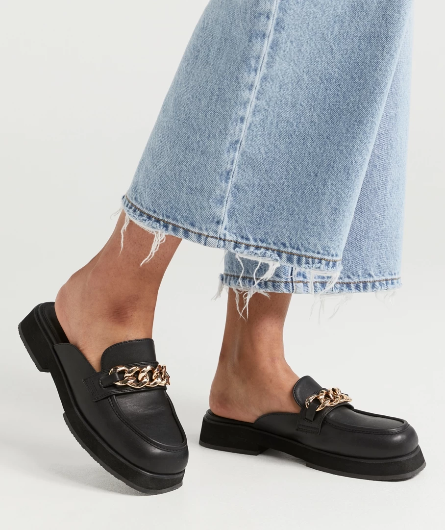 The Rylee Backless Loafer is a must have this season. Made with a smooth black material together with a gold detail chain. A comfortable flatform helight. The perfect loafer to elevate any look.