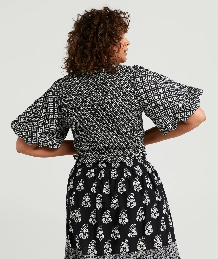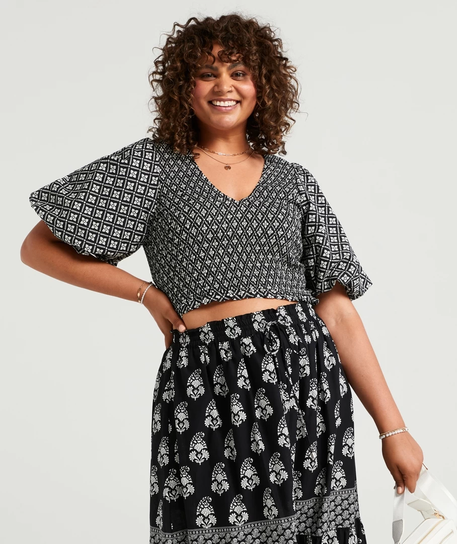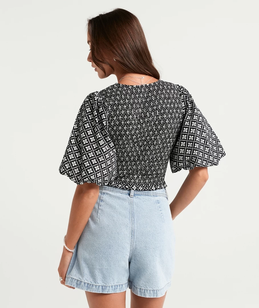 Take on the day with the Serenity Cotton Shirred Puff Sleeve Top. Made with 100% cotton, short puff sleeves, low neckline and fun print detail all over. Pair with a pretty bag for a casual day out.