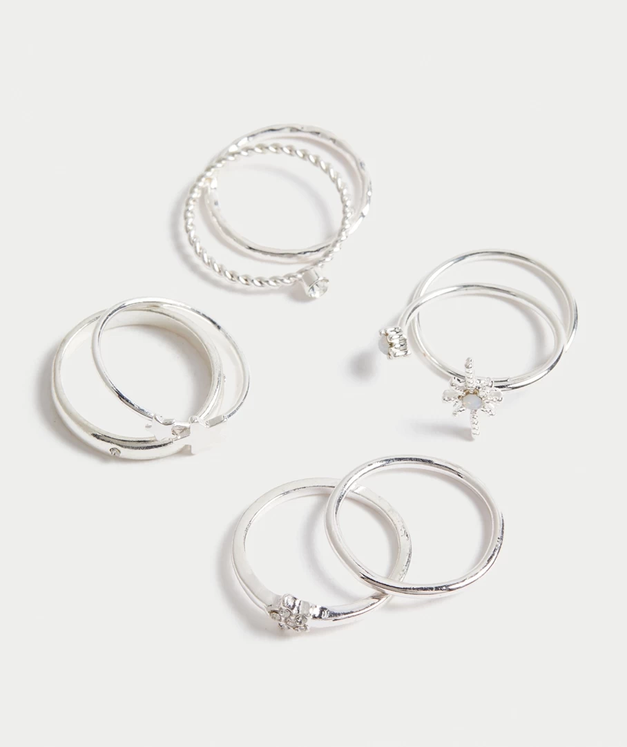 We are all about layers this season and that includes our fingers. Wear them all or only a few to elevate your look. The Silver Celestial Ring Pack silver coloured rings all with different designs.