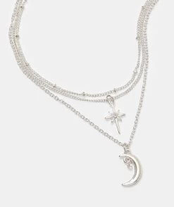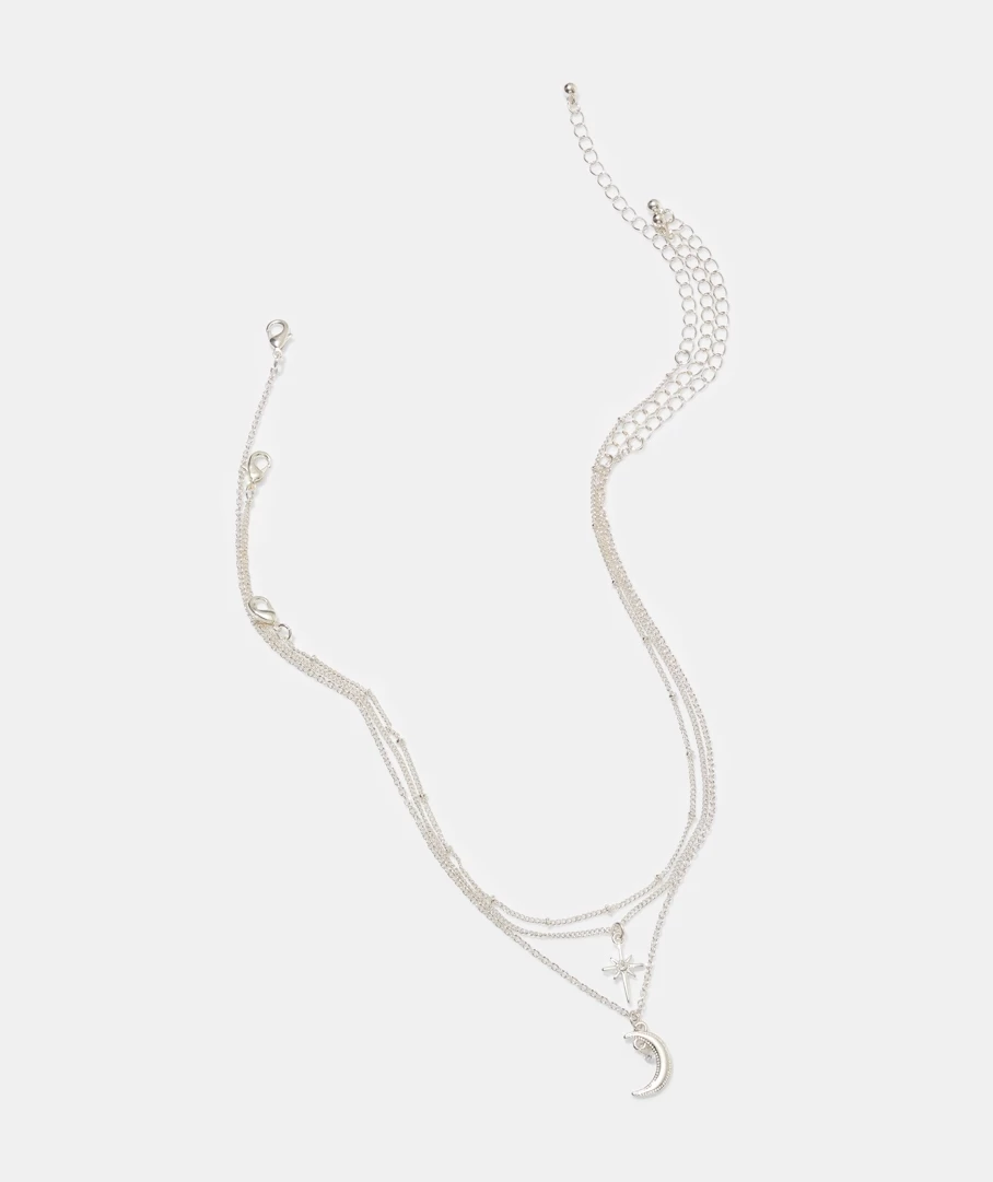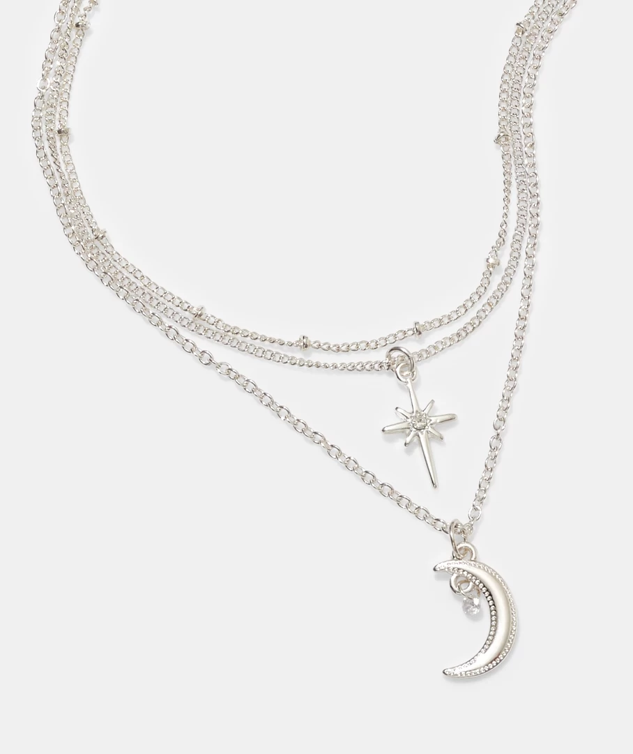 Our Silver Star and Moon layered necklace features 3 fine necklaces – a short chain, a middle chain with a star pendant and a long chain with a moon pendant. Each necklace has its own clip so you can mix and match. This jewellery piece may contain low levels of nickel in the metal composition, or have been exposed to traces of nickel at some stage of the production process.