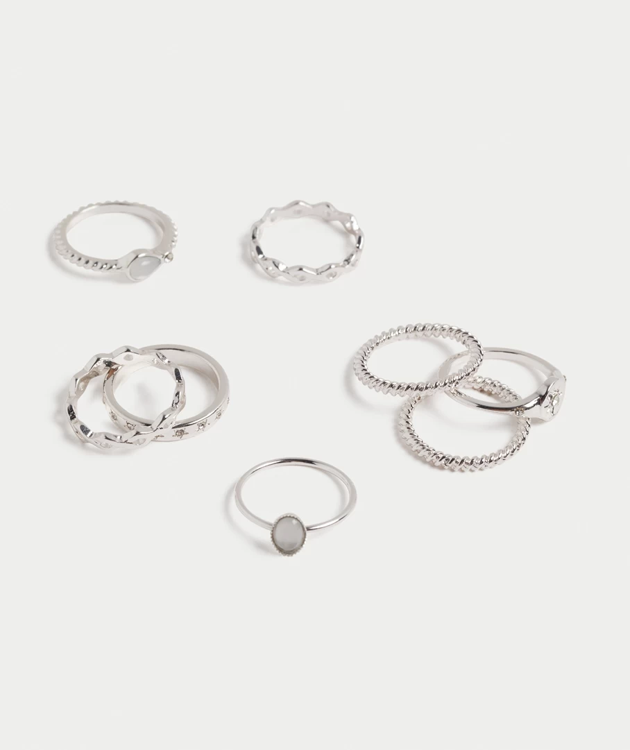We are all about layering this season and that includes on your fingers! This pack features silver-coloured rings, all in different shapes and sizes. Wear them all at once or mix and match.