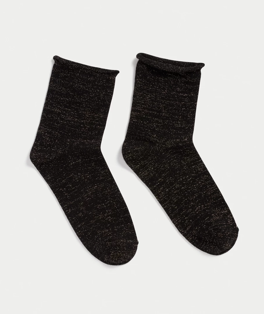 Treat your feet with the Sparkle Purple Metallic Roll Down Sock. These socks will add some fun to your look. They feature black/gold metallic fabric throughout and a roll down effect at the hemline.