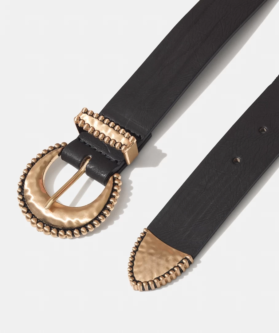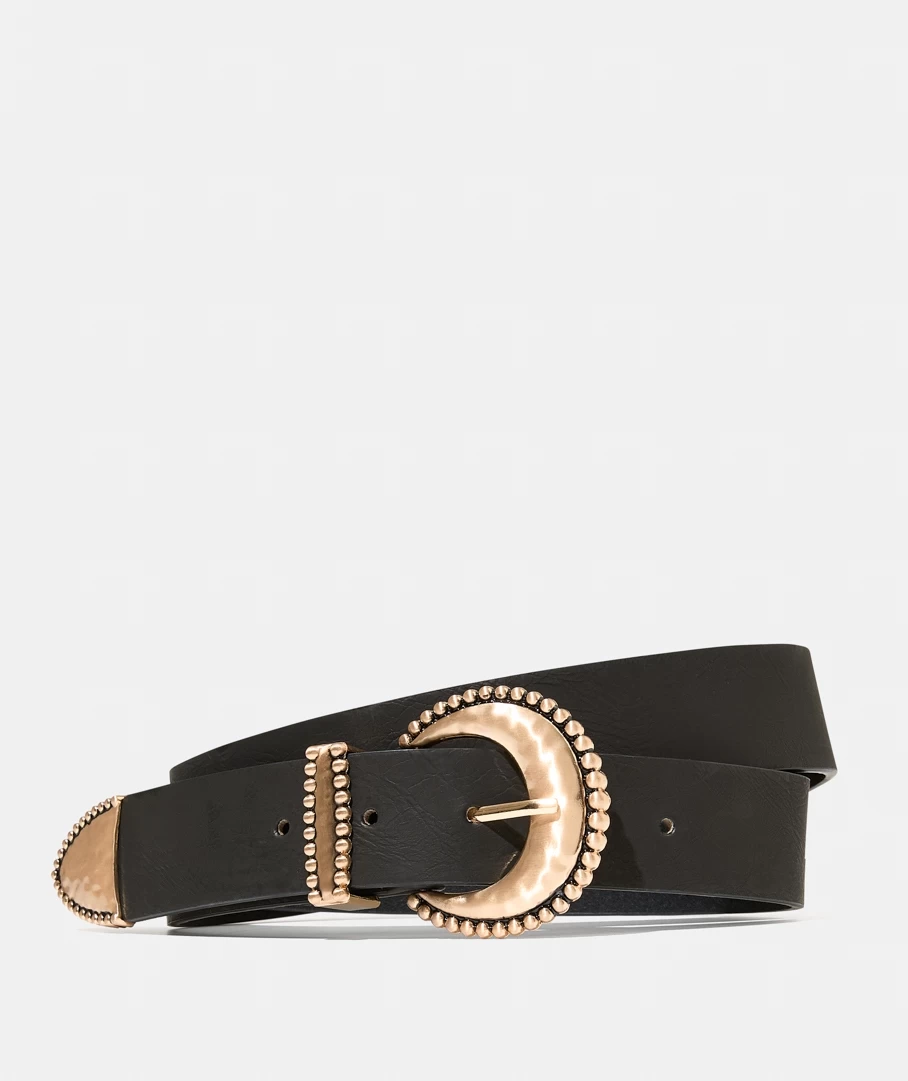 The Stevie Moon Buckle Belt features a black faux leather look, rustic gold coloured metal details and metal belt hoop. Wear it casual during the day or with a dressier outfit at night.