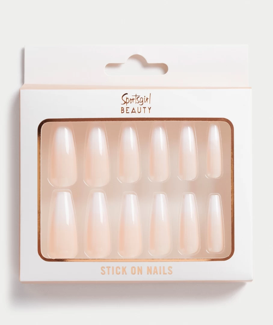 These stick on nail will give you instant glam. This pack of 24 stick on nails feature a coffin shape and ombre white colour.