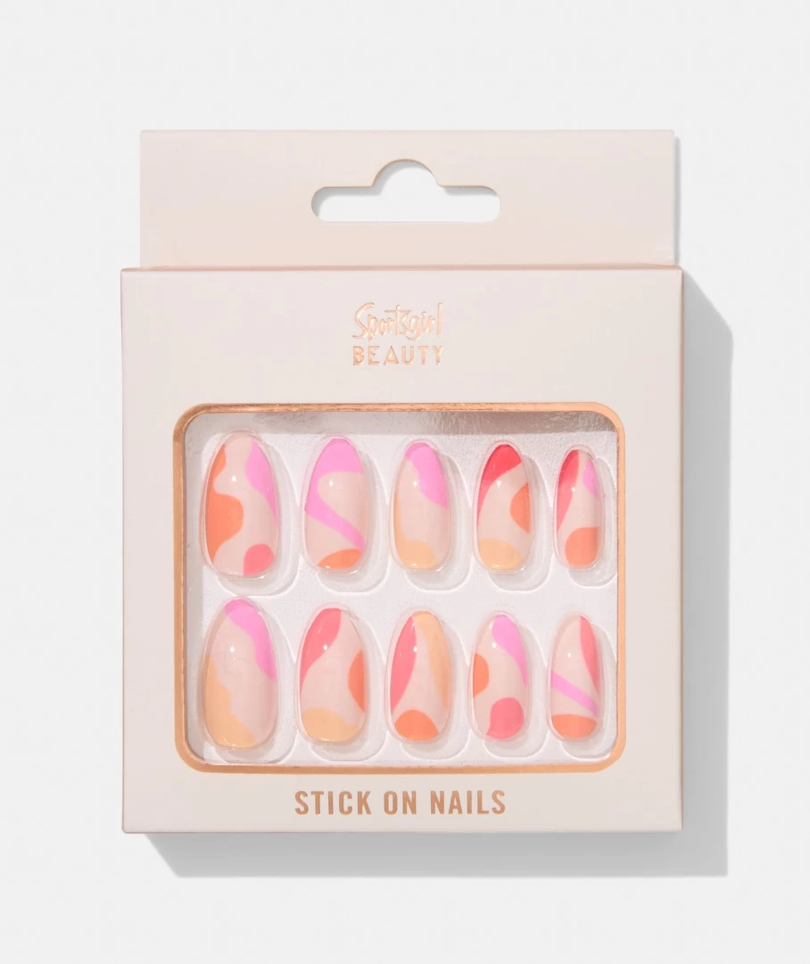 These stick on nail will give you instant glam. This pack of 24 stick on nails feature pretty pink and orange swrils.