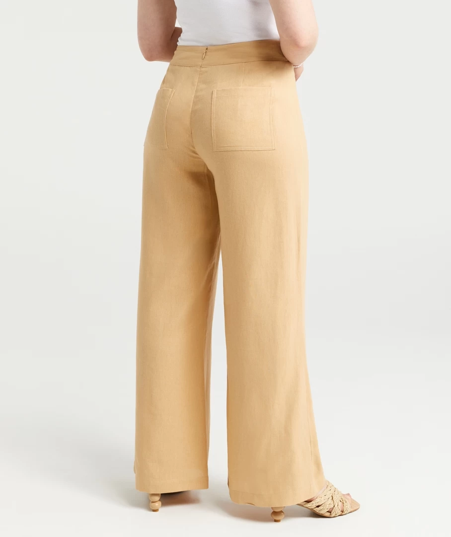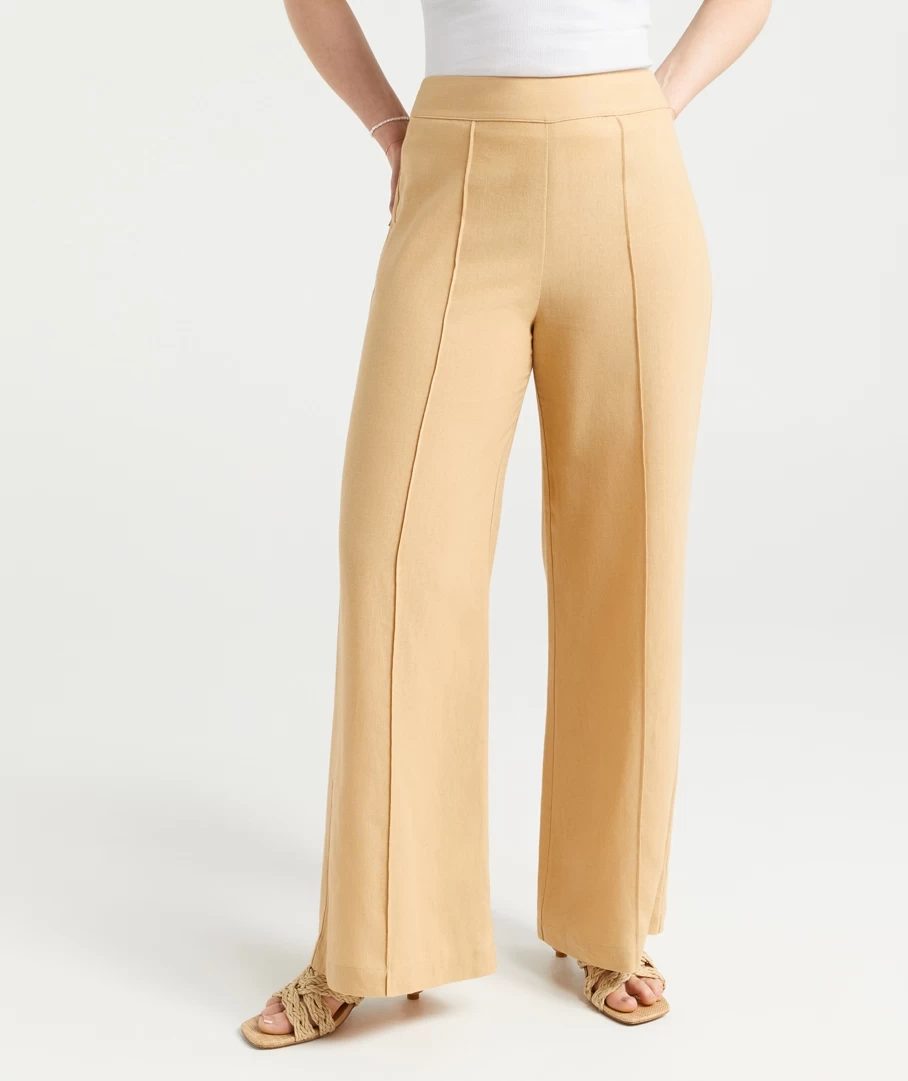 Dress it up or down, the Tanisha Linen Fitted Flare Pants are a must have. Made with a linen blend, wide leg fit, high waisted, elastic waistband, stitching detail down the front and camel colour. Add a pretty bag to complete your look.