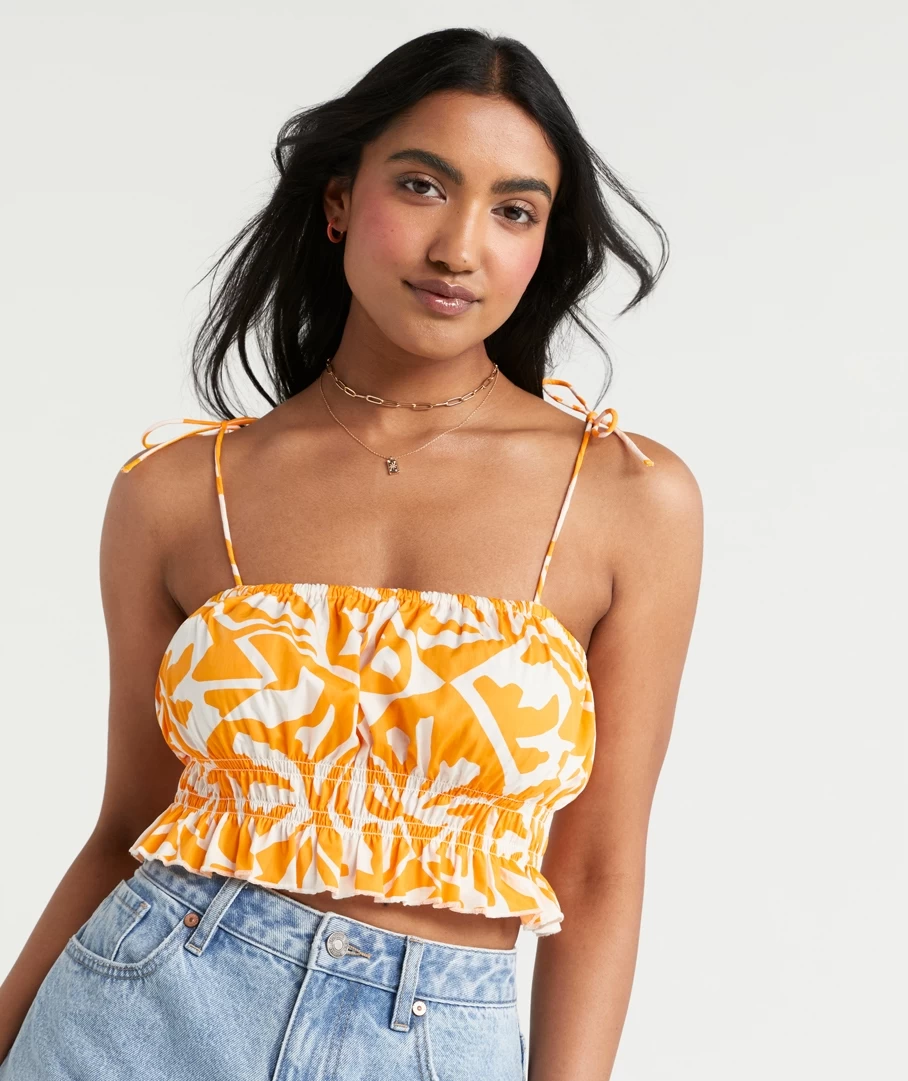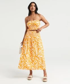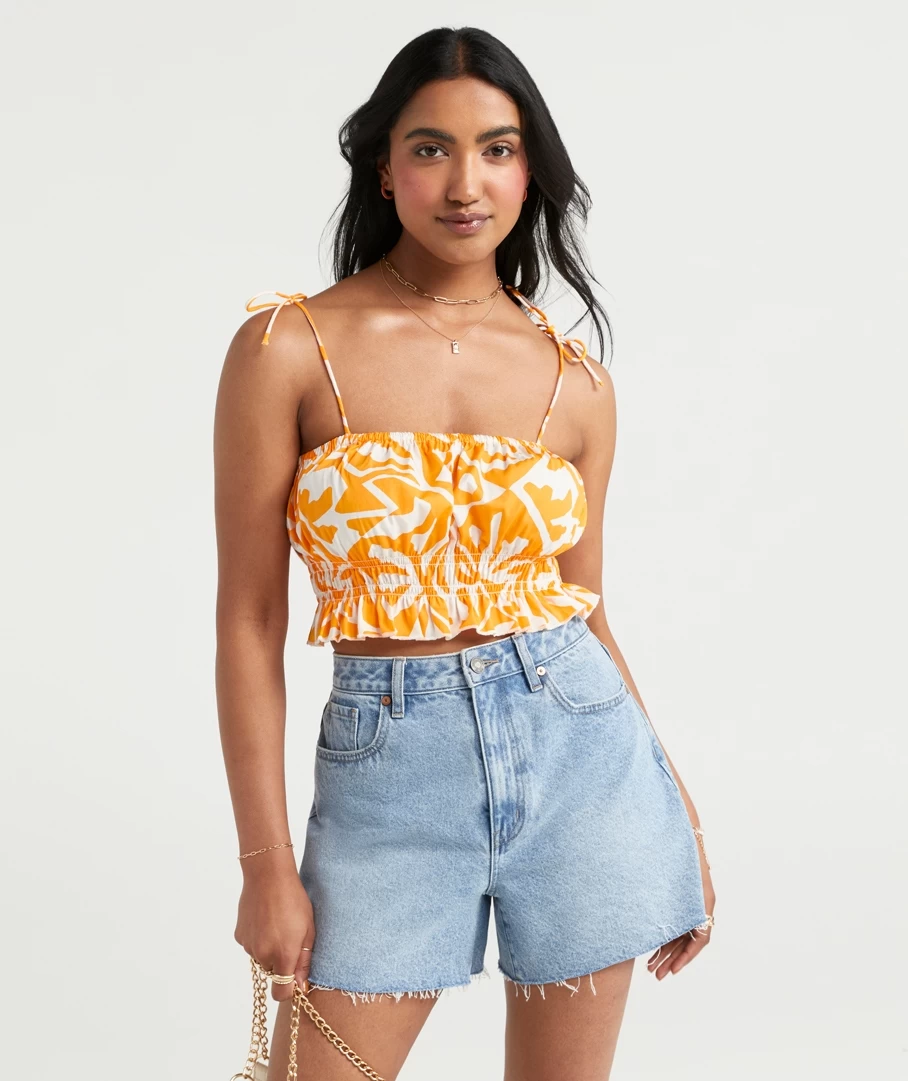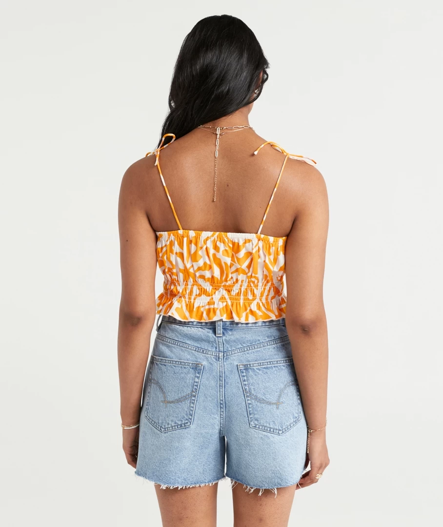 Be ready for the warmer days with the Tatum Shirred Cami. Made with 100% cotton, cropped length, tie up thin straps, shirred front and pretty yellow and white print all over. Pair with its matching midi skirt or your fave denim bottoms.