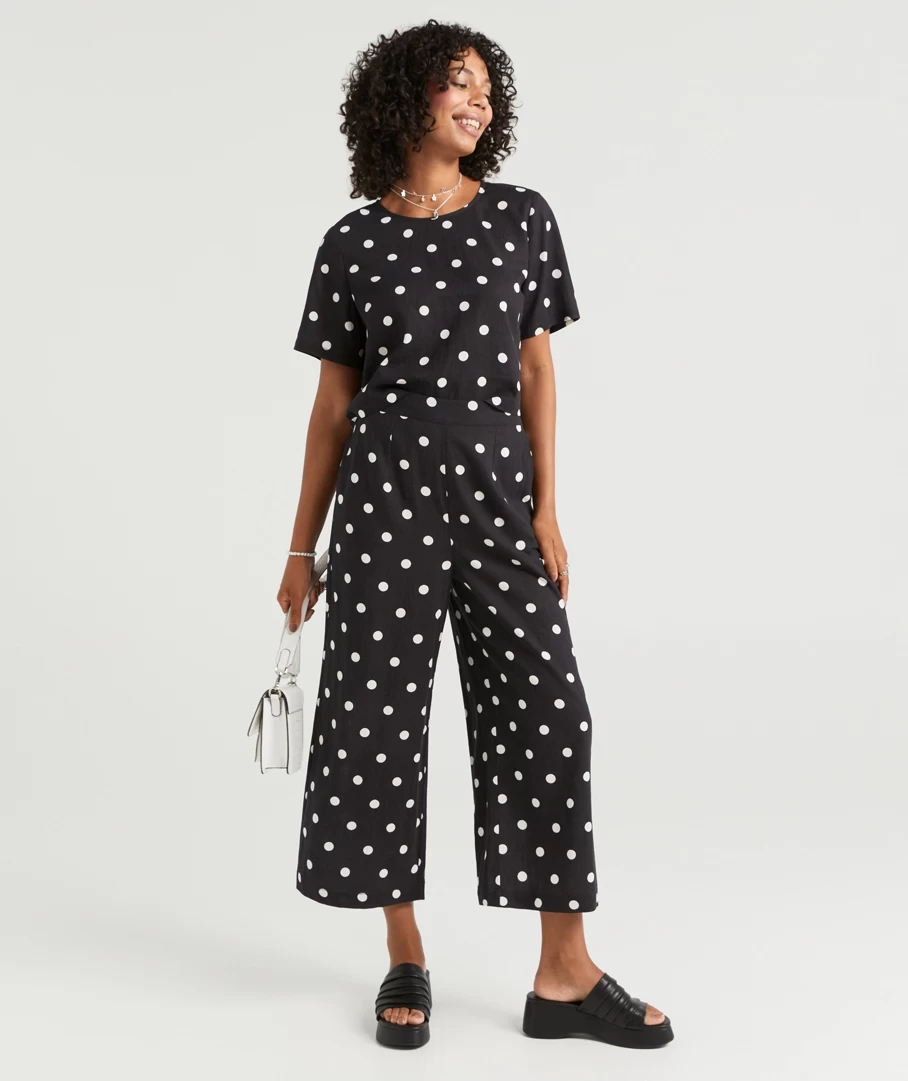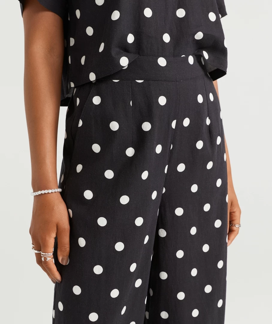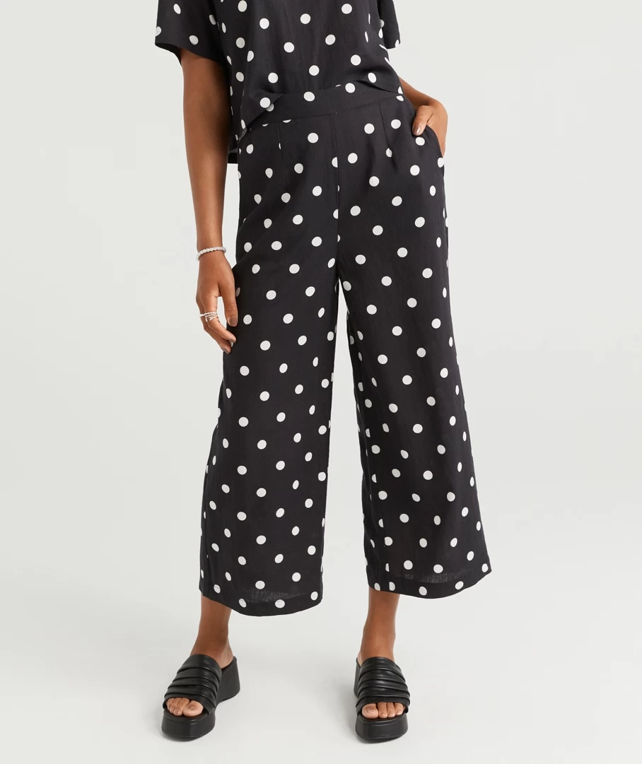 It is all in the print with The Linen Printed Culotte Pants. Made with a linen blend, cropped length, flat front waist band, side pockets, shirred back waist and fun print. Pair with its matching linen top for a set.