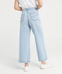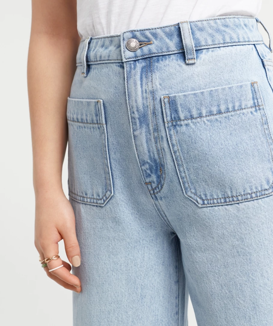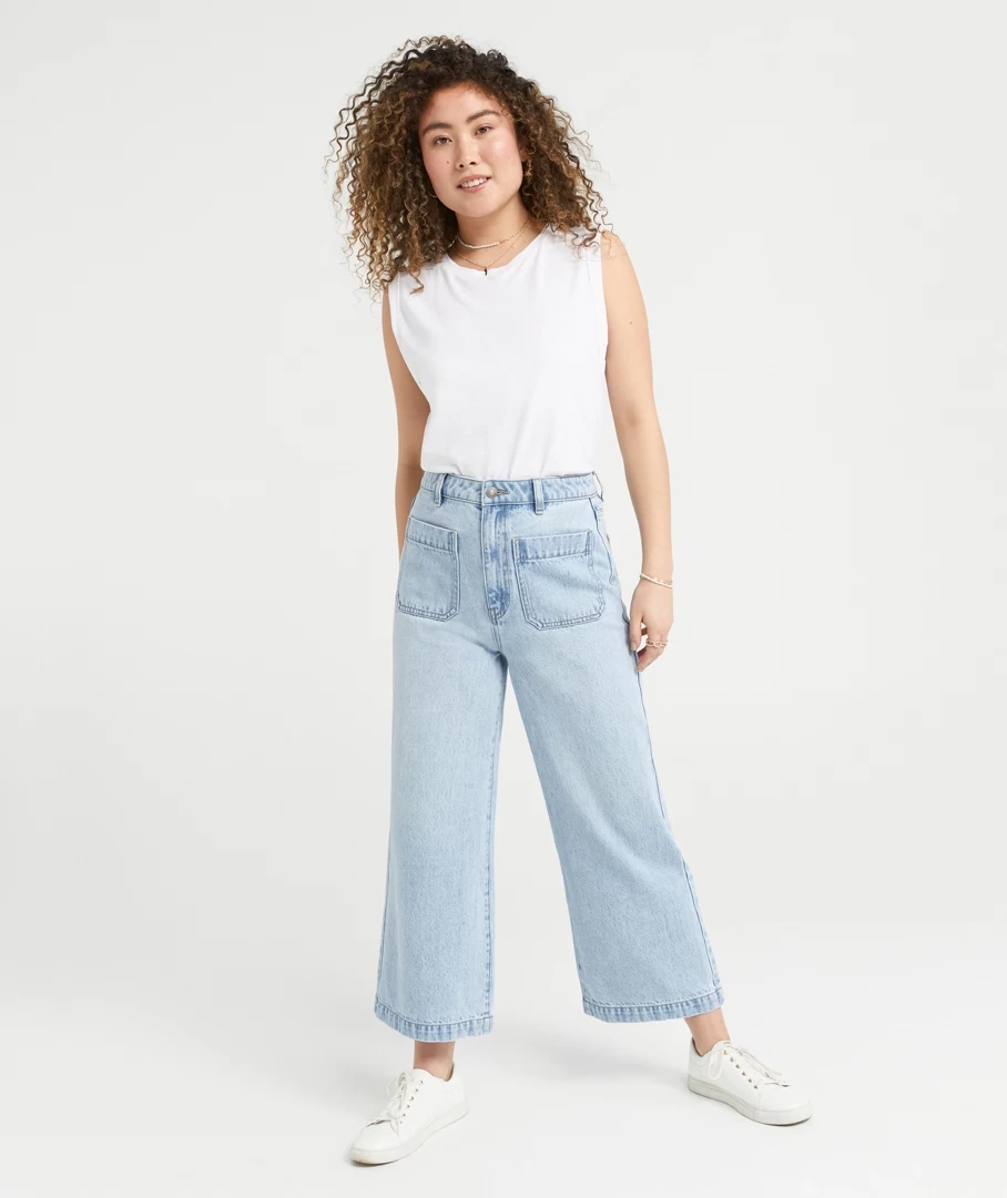 Adding chic patch work pockets to a beloved denim style – the Culotte Jeans. With 100% cotton, wide fit throughout, cropped length, stitched hem, two pockets on the front and back and two metal buttons with a zip closure. Pair with a basic tee for a casual look.