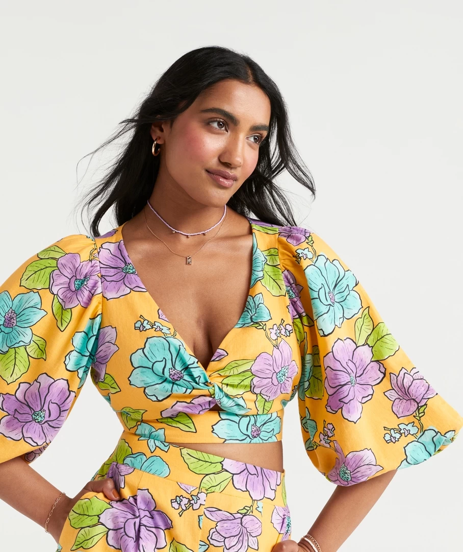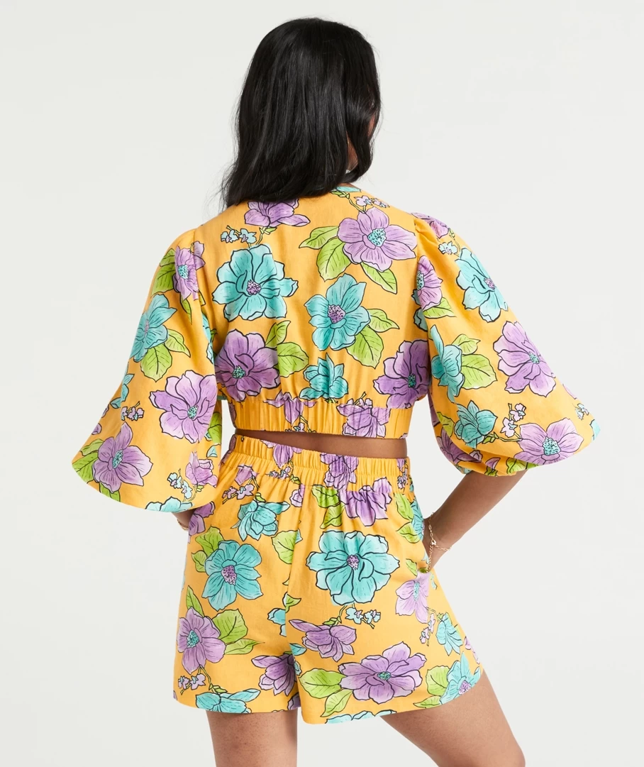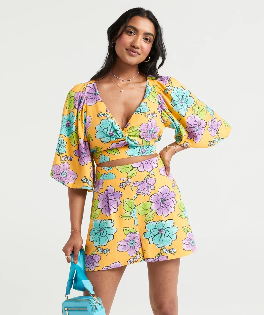 Its all in the print with the Tiffany Linen Cut Out Puff Sleeve Top. Made with a linen blend, cropped length, short cuffed sleeves, twisted front detail and floral print all over. Pair with its matching shorts for the ultimate set. Finalise the look with a cute pair of heels.